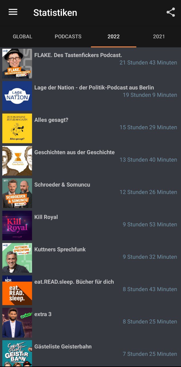 Die obenstehenden Angaben sind das Einzige, was ich retten konnte. Wir sehen also hier die üblichen Verdächtigen in trauter Reihenfolge. Keine allzu großen Überraschungen. Weiterhin fehlen die Premiumprodukte aus der Metaebene, offensichtlich scheint der geschätzte Tim Pritlove weiterhin in der Findungsphase zu sein. Nur wenige erwähnenswerte Neuzugänge finden sich in der Liste. Eigentlich fällt in dieser Hinsicht nur „Kuttners Sprechfunk“ ins Gewicht, den ich aus unerfindlichen Gründen lange Jahre nicht mehr meine Aufmerksamkeit schenkte und es nun umso mehr genoss.